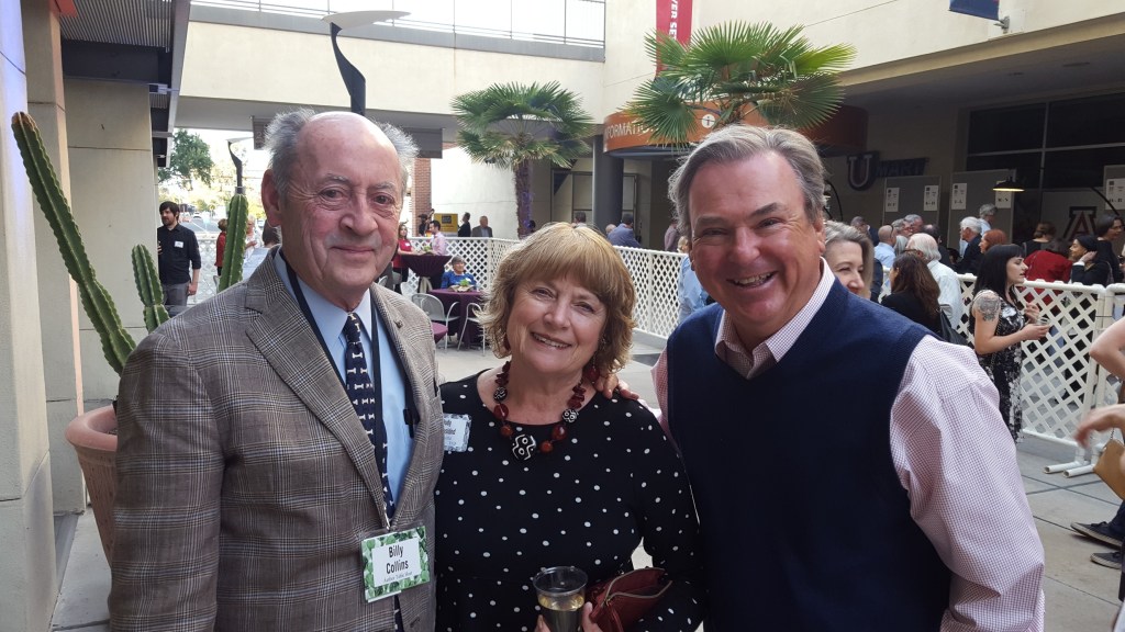 Years later, in Tucson, Arizona, a far different clime, my husband and I attended the Tucson Book Festival with dear friends who lived there. Imagine the surprise of seeing Billy Collins walking toward us, on the same sidewalk, at the same time, on the same day. My friend said, “Let’s do this. We can’t let this treasure go by.” He led off, “Mr. Collins, do you have a moment?” We wanted to tell him what his work had meant to us, and to our surprise, he was interested in conversation. “Who were we? Where did we live? Did we like poetry?” In short, one of the richest conversations I’ve ever had the privilege to engage in, transpired. We reminded him that we had heard him read on Bainbridge Island, years ago. Like us, he remembered the weather that afternoon. We talked more about that event and his poetry, as if we were long time friends, and for the two of us who had read all of his works, I like to think that we were.